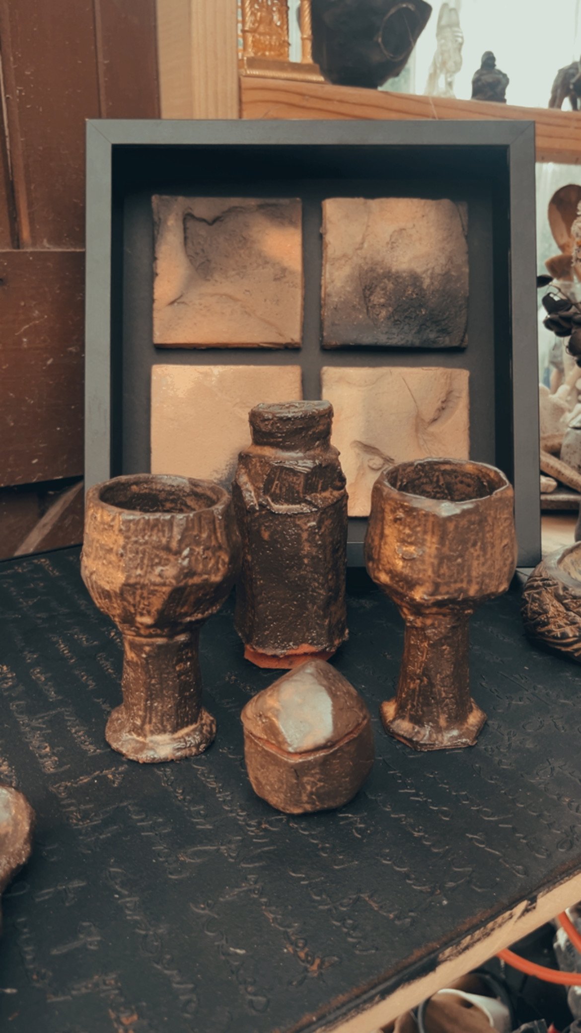 Shop › Red earth kurinuki set Image 1 of 1 Red earth kurinuki set $95.00 This 4 piece hand carved set includes 2 goblets, 1 bottle and 1 jarAll glazed in earthy mat shino Add To Cart Added! This 4 piece hand carved set includes 2 goblets, 1 bottle and 1 jarAll glazed in earthy mat shino